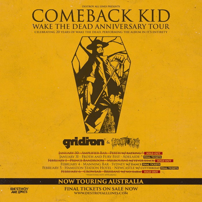 TOURING SOON: Canadian hardcore punk icons Comeback Kid will celebrate the 20th anniversary of their seminal album 'Wake The Dead' with support from GRIDIRON and Phantoms