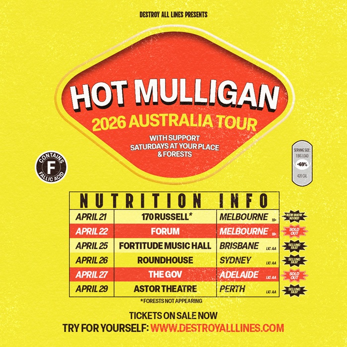 NEW MELBOURNE SHOW ADDED! After conquering Australia on their 2024 debut run, Michigan's post-emo heroes Hot Mulligan will return in 2026 for the Sound A Body Makes When It's Still Australian Tour..