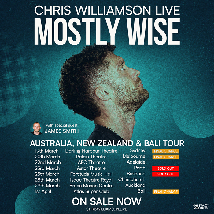 JUST ANNOUNCED! Chris Williamson hits the road across Australia, New Zealand, and Bali with his Mostly Wise live show, bringing his journey and insights directly to audiences.