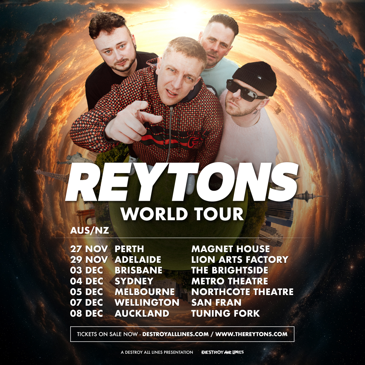 Just Announced! UK music’s biggest underdogs, indie rock juggernauts The Reytons, keep charging forward on their unstoppable rise. Having flirted with overseas territories successfully over the past 5 years, the band are now heading out on their very first World Tour, and have announced their return to Australia and New Zealand this November and December