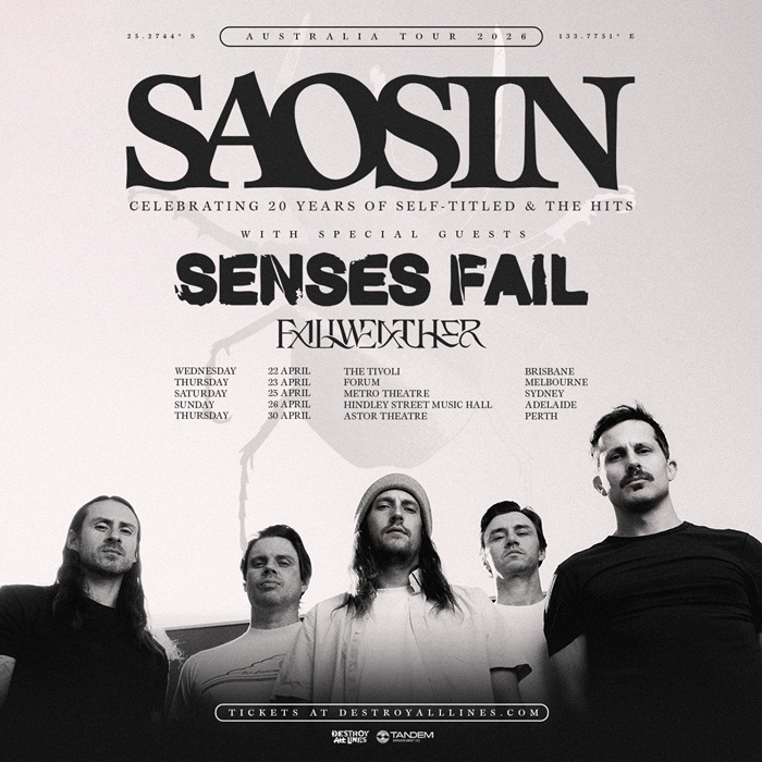 NATIONAL SUPPORT ANNOUNCED! Saosin are heading down under in April with Senses Fail. With vocalist Cove Reber back in the fold, the beloved Orange County post-hardcore band will mark the 20th anniversary of their extraordinary self-titled album by performing it in its entirety!