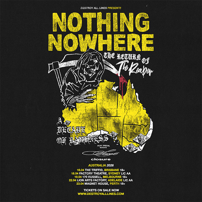 JUST ANNOUNCED! Celebrating a decade of darkness since first announcing himself to the world, in 2026 American rapper and genre alchemist nothing, nowhere. will return down under, bringing his The Return Of The Reaper tour across the country next April alongside special guests sace6 (usa) for their first ever Australian visit and Sydney's Closure.