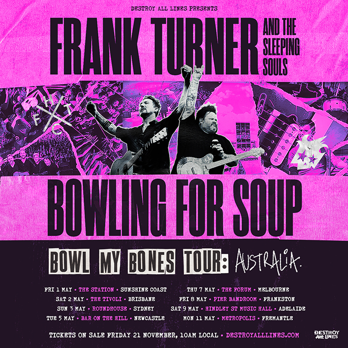 ON SALE NOW! Australia, get set to be bowled over in 2026, with beloved UK folk punk act FRANK TURNER & THE SLEEPING SOULS joining forces with Texan pop punk mainstays BOWLING FOR SOUP for a monumental co-headline Australian tour next May.