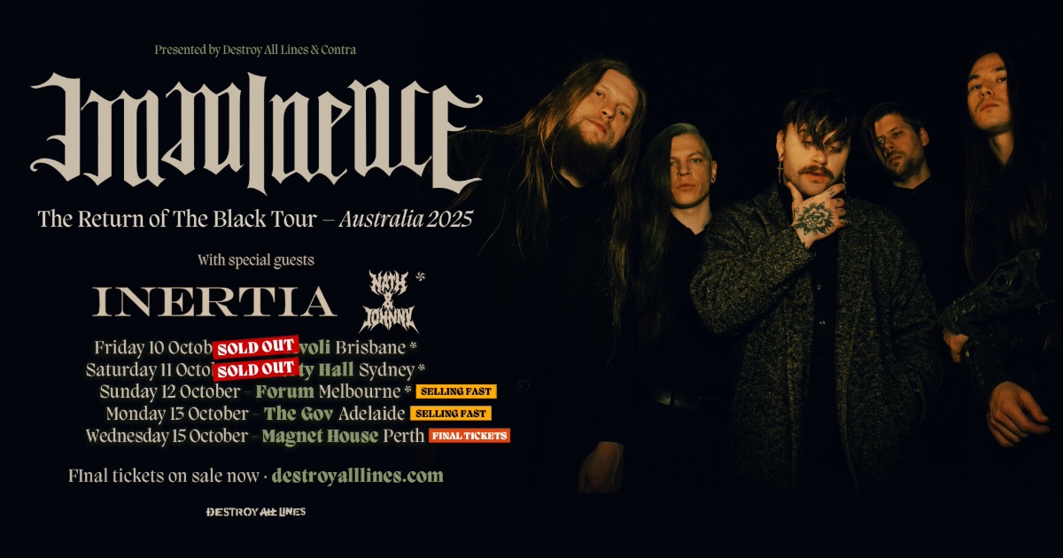 One of the most in-demand acts in modern alternative music, Swedish violincore pioneers IMMINENCE return to Australian shores this October. Brisbane and Sydney have now sold out and Melbourne gets a venue upgrade with limited tickets left for all shows on The Return Of The Black Australian tour.