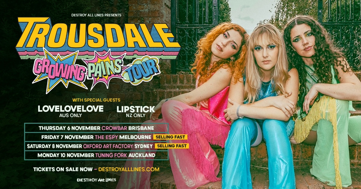 Back in April, Trousdale released their sophomore album Growing Pains via Independent Co. For the trio made up of Quinn D’Andrea, Georgia Greene, and Lauren Jones, the ache of growing through change resonates deeply. In the time since, the band has gone on to make their daytime TV debut on The Kelly Clarkson Show, toured alongside Maren Morris, and sold out date after date across their extensive headline tour of North America and the UK/EU before heading to Australia & New Zealand this November with support from Lovelovelove (Aus only) & Lipstick (NZ only).