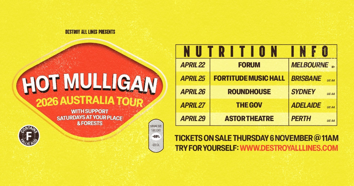 After conquering Australia on their 2024 debut run, Michigan’s post-emo heroes Hot Mulligan will return in 2026 for the Sound A Body Makes When It’s Still Australian Tour. Kicking of in Melbourne on April 22, Hot Mulligan will do a lap around the country delivering their signature blend of raw emotion and high-octane energy to stages across Brisbane, Sydney, Adelaide and Perth.