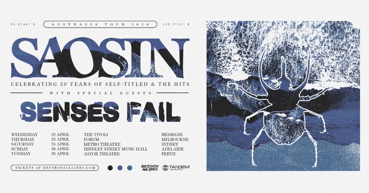 Orange County post-hardcore trailblazers Saosin will return to Australia in April 2026 for a national headline tour, celebrating 20 years of their iconic self-titled album - playing the album in full as well as the hits. Joining them across all dates is special guests and post-hardcore legends Senses Fail.