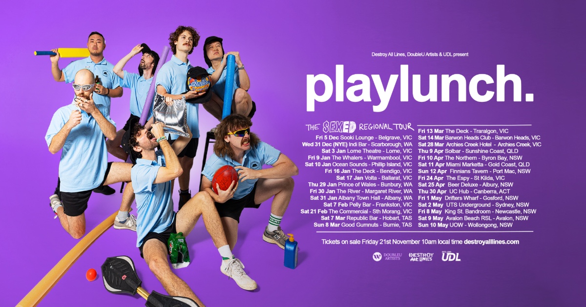 Big lunch is BACK! Melbourne bogan-funk favourites Playlunch are set to bring their nostalgia-packed, good-time-guaranteed live shows across the east coast on a mammoth 29 date run in late 2025 and into 2026. Kicking off with an already sold out show in Belgrave, the Sex Ed Regional Tour will hit headline and festival stages across VIC, TAS, QLD, NSW, WA, and ACT from December through to May.