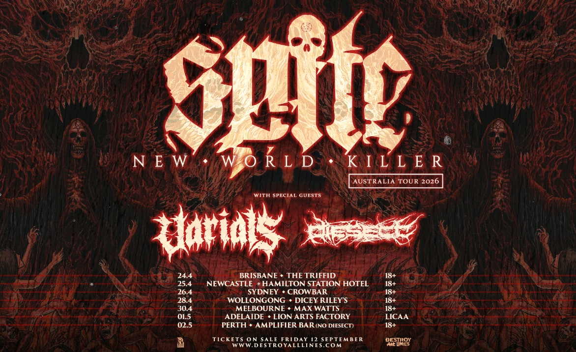 Southern California’s Spite, the decibel and soul crushing deathcore unit, will return to Australia in April 2026 for their first-ever Australian headline tour, bringing with them Pennsylvania’s Varials and local heavyweights DIESECT.